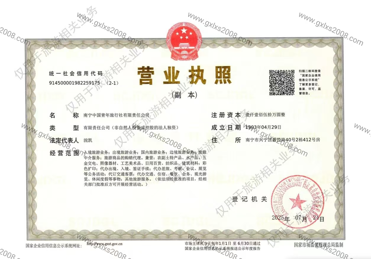 南宁中国青年旅行社组团出境游国际旅行社经营许可证号:L--GX--CJ00013